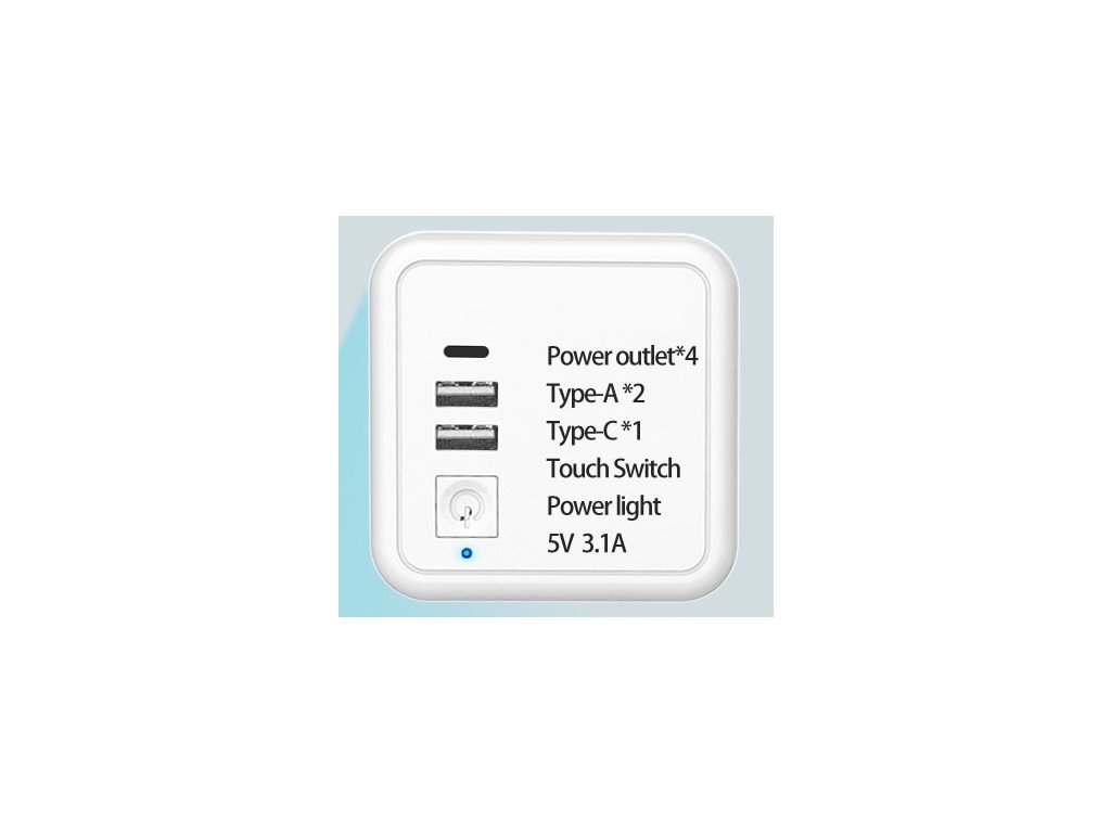 Rozbočovač umožňuje připojení až 7 zařízení. K dispozici jsou 3 klasické zásuvky (250 V, 16 A, 3680 W), bezdrátové nabíjení s výkonem 15 W, 2 USB-A porty (5 V, 3,1 A) a 1 USB-C port (5 V, 3,1 A).
